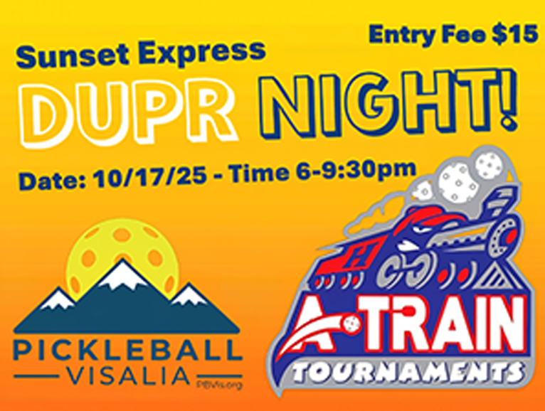 DUPR Night at Plaza Park, brought to you by A-Train and Pickleball Visalia! 10/17/25 6:00-9:30pm. Entry Fee: $15. Pickleball Visalia Club Members will receive priority registration! Another great reason to join Pickleball Visalia! 64 players max. Registration starts 9/1/25. Contact Jon Bray, Pickleball Visalia General Officer @ 559.393.5245